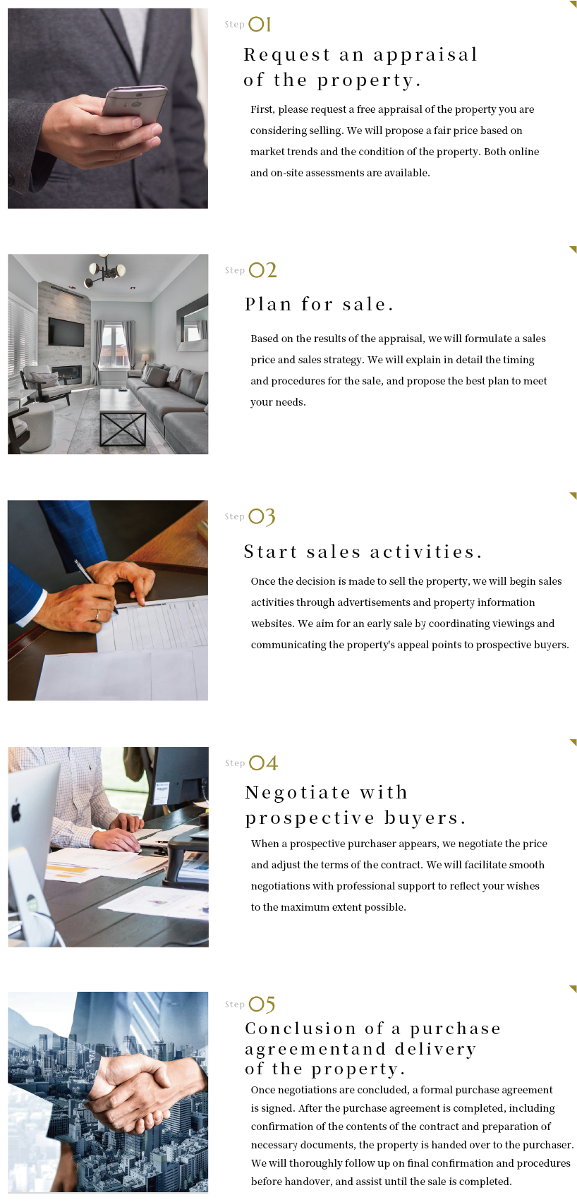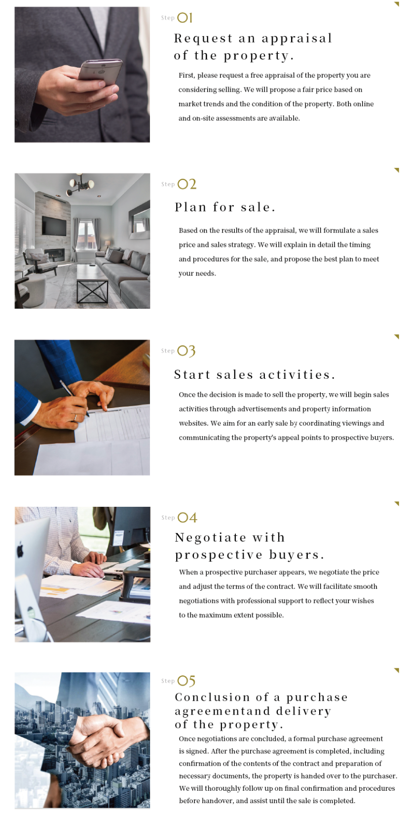 We offer a total solution that supports everything from property management to buying, selling, and leasing. Our staff with specialized knowledge and experience in each process work together to minimize the burden on our clients. This allows our clients to proceed with real estate transactions with peace of mind and experience our one-stop service.